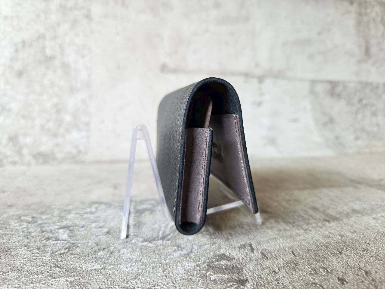 名刺を入れるポケットは名刺が良く見え、取り出しやすいように高さを低めに設定してあります。(1cmほど名刺が見える)