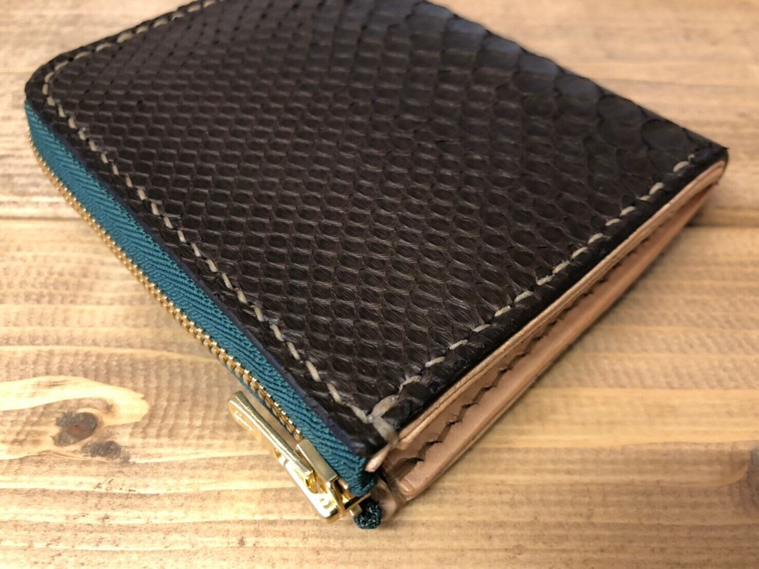 表革にはダイヤモンドパイソン(ヘビ革)、裏革にはヨーロッパ産の牛ヌメ革を使い全て手縫いで縫製して製作しました。ファスナーにはYKKの高級ファスナー「エクセラ」を使用しています。